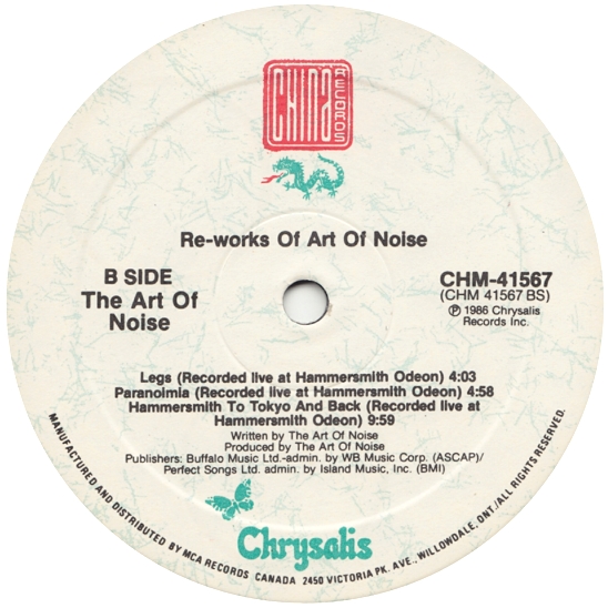 The sleeve and the label on side A list Legacy (Extended Version) as Legacy (12" Version) and Peter Gunn (Extended Version) as Peter Gunn (12" Version). Label on side B list Legs (Live) as Legs (Recorded Live at Hammersmith Odeon); Paranoimia (Live) as Paranoimia (Recorded Live at Hammersmith Odeon) and Hammersmith To Tokyo And Back (Live) as Hammersmith To Tokyo And Back (Recorded Live at Hammersmith Odeon). Side B composers are listed as The Art of Noise.