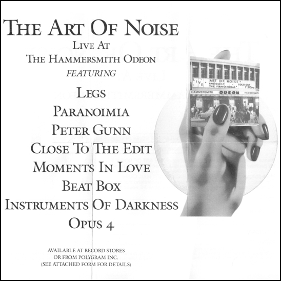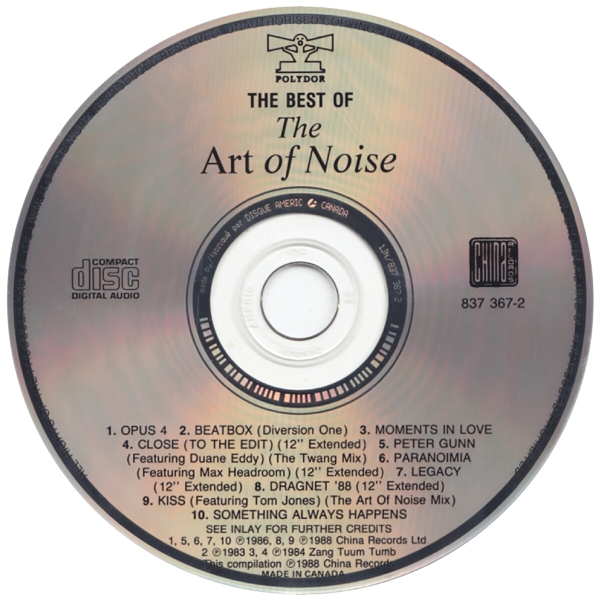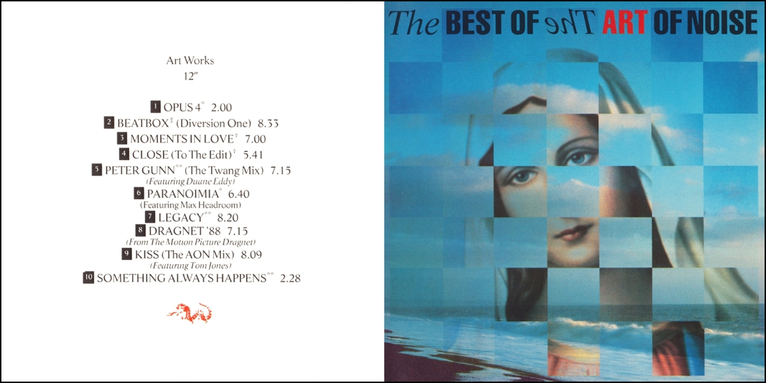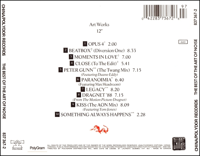 length as the 12". Moments In Love (Beaten) listed as Moments In Love; Close (To The Edit) as Close (To The Edit) (12" Extended) [Label] Paranoimia (Extended Version) as Paranoimia [label: Paranoimia (12" Extended)]; Legacy (Extended Version) as Legacy [label: Legacy (12" Extended)]; Dragnet '88 (12" Mix) as Dragnet '88 [label: Dragnet '88 (12" Extended)]; Kiss (AON Mix) as Kiss (The Art of Noise Mix) [label]. The